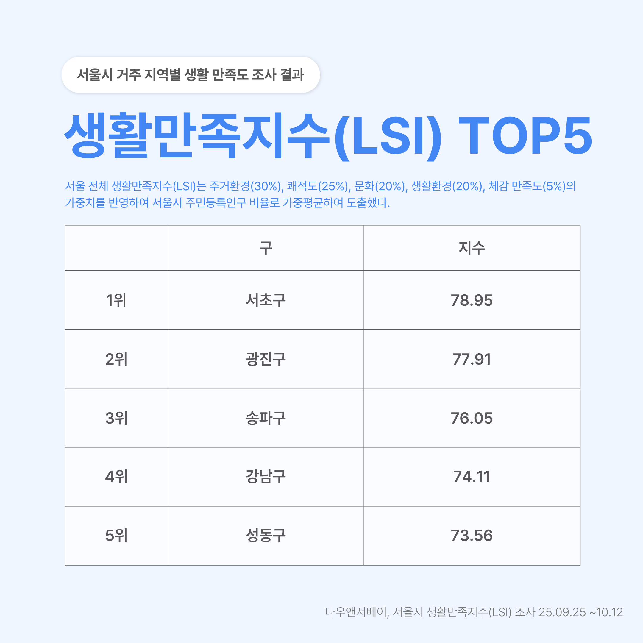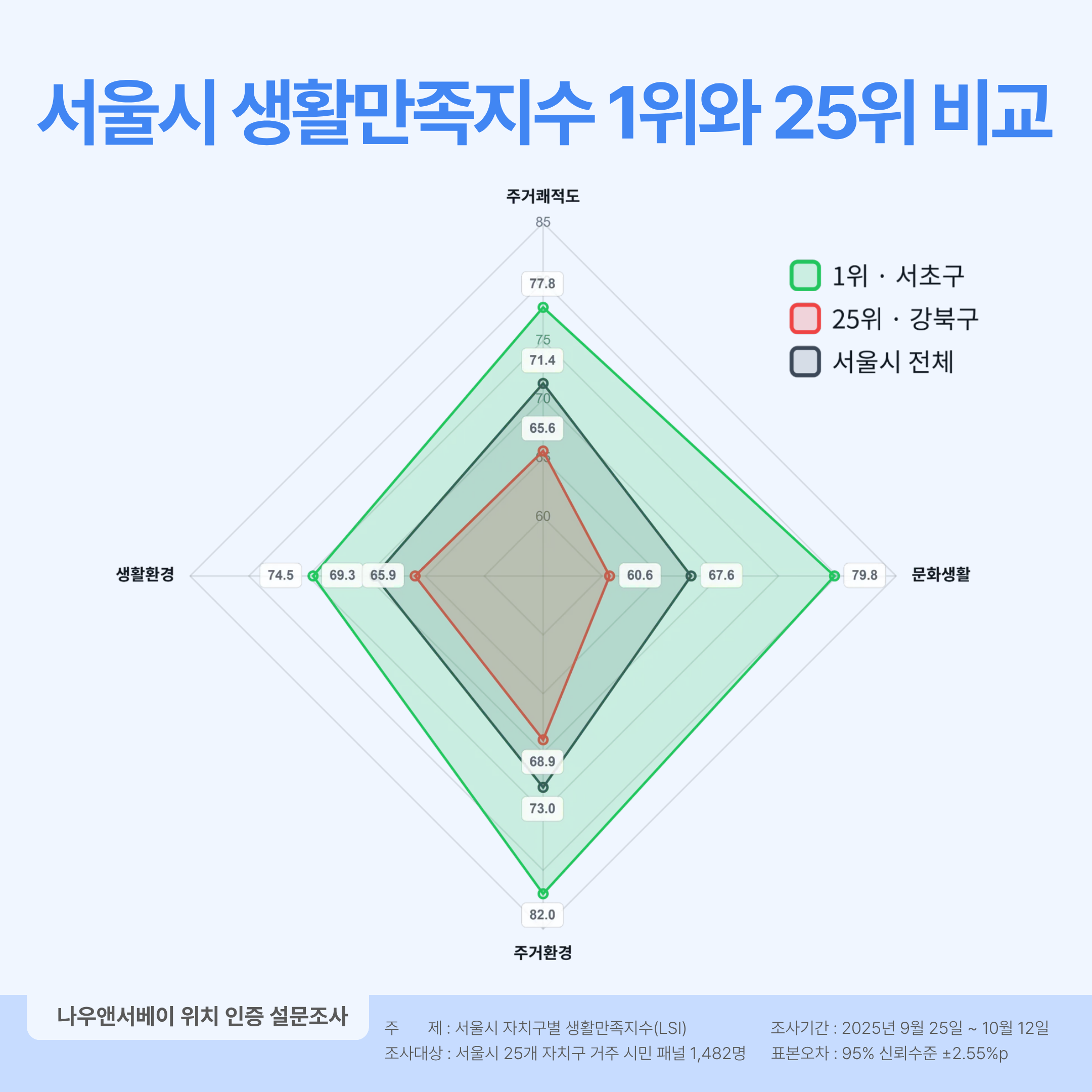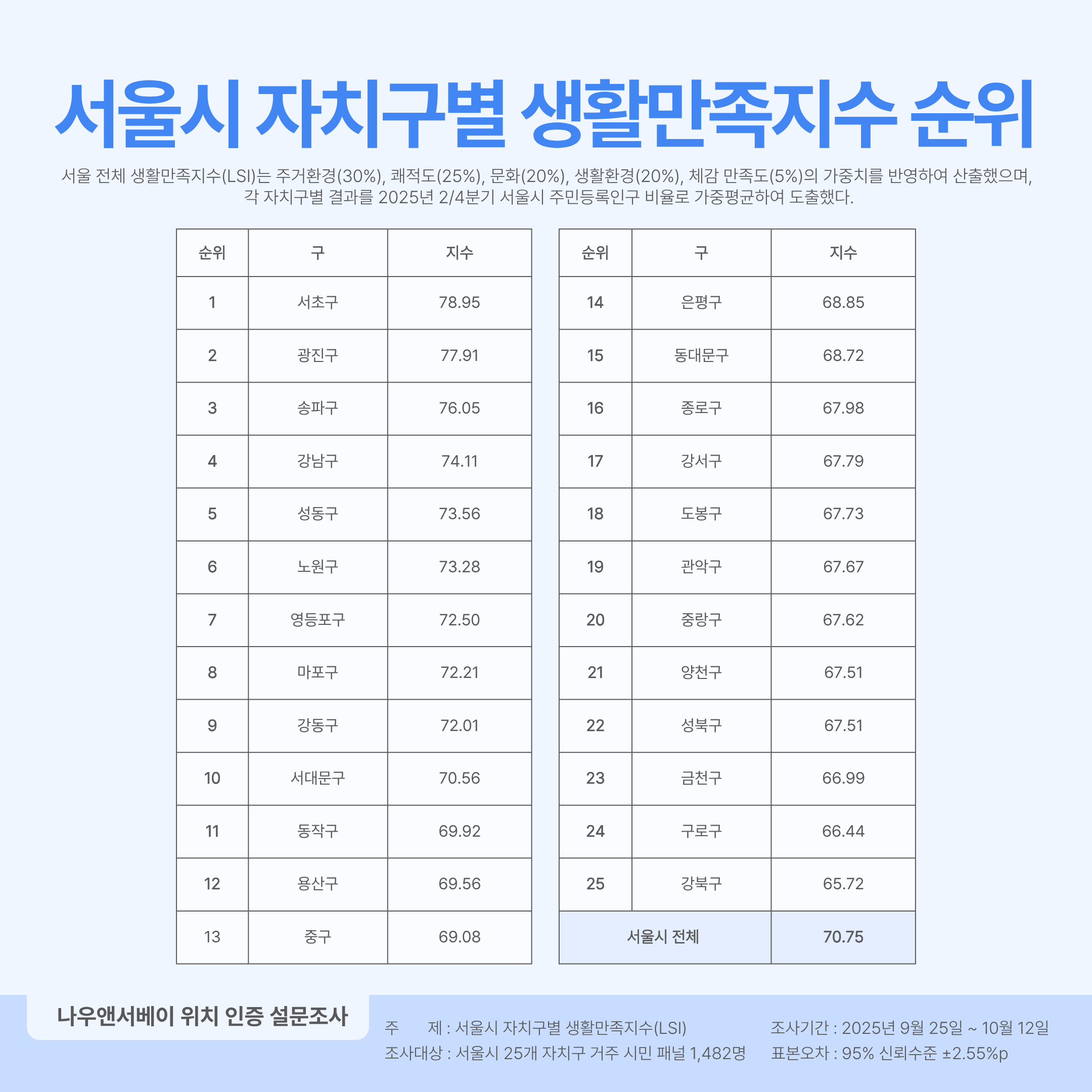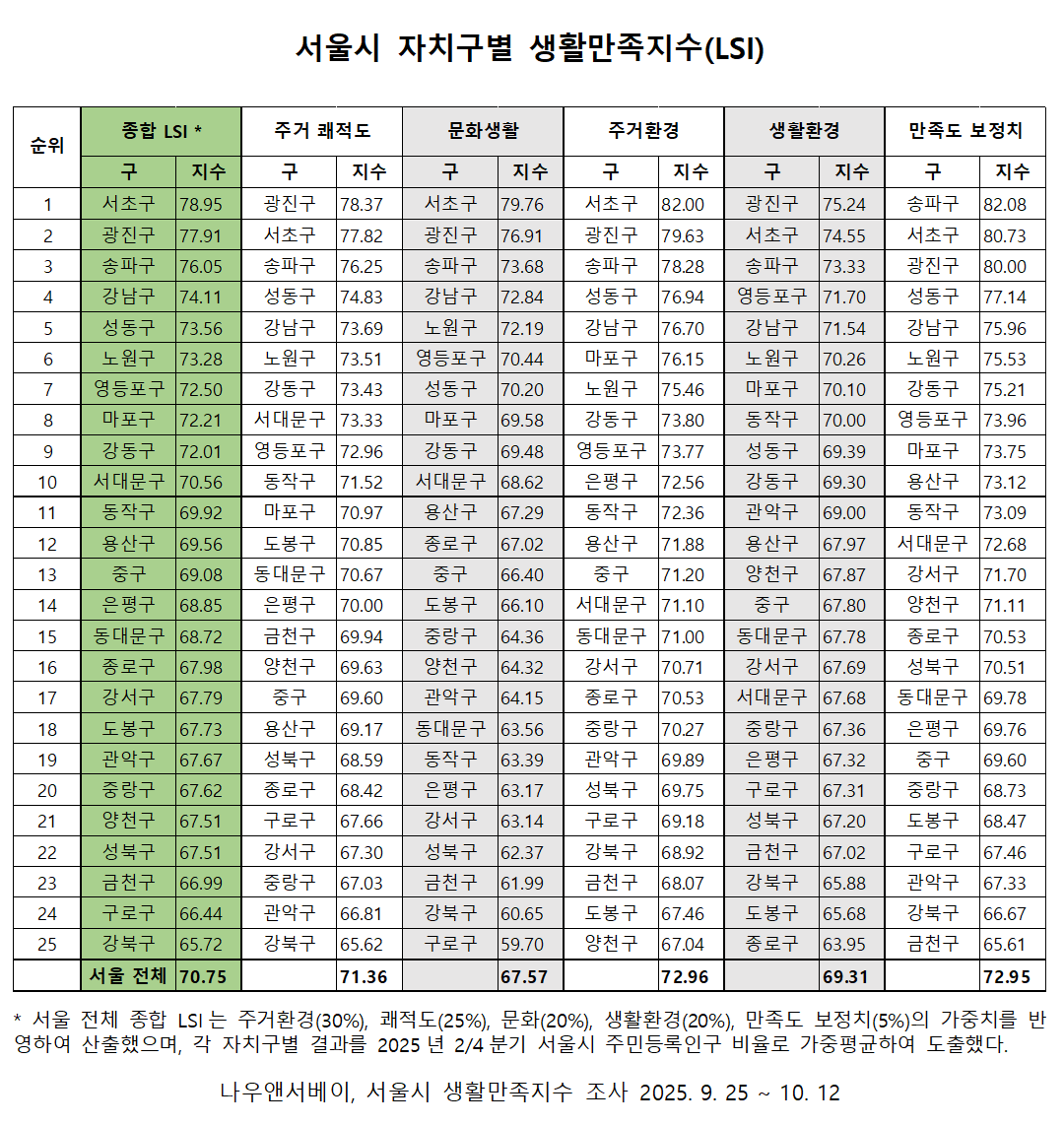 나우앤서베이, 서울시 생활만족지수(LSI) 조사 발표… 1위 서초구, 25위 강북구