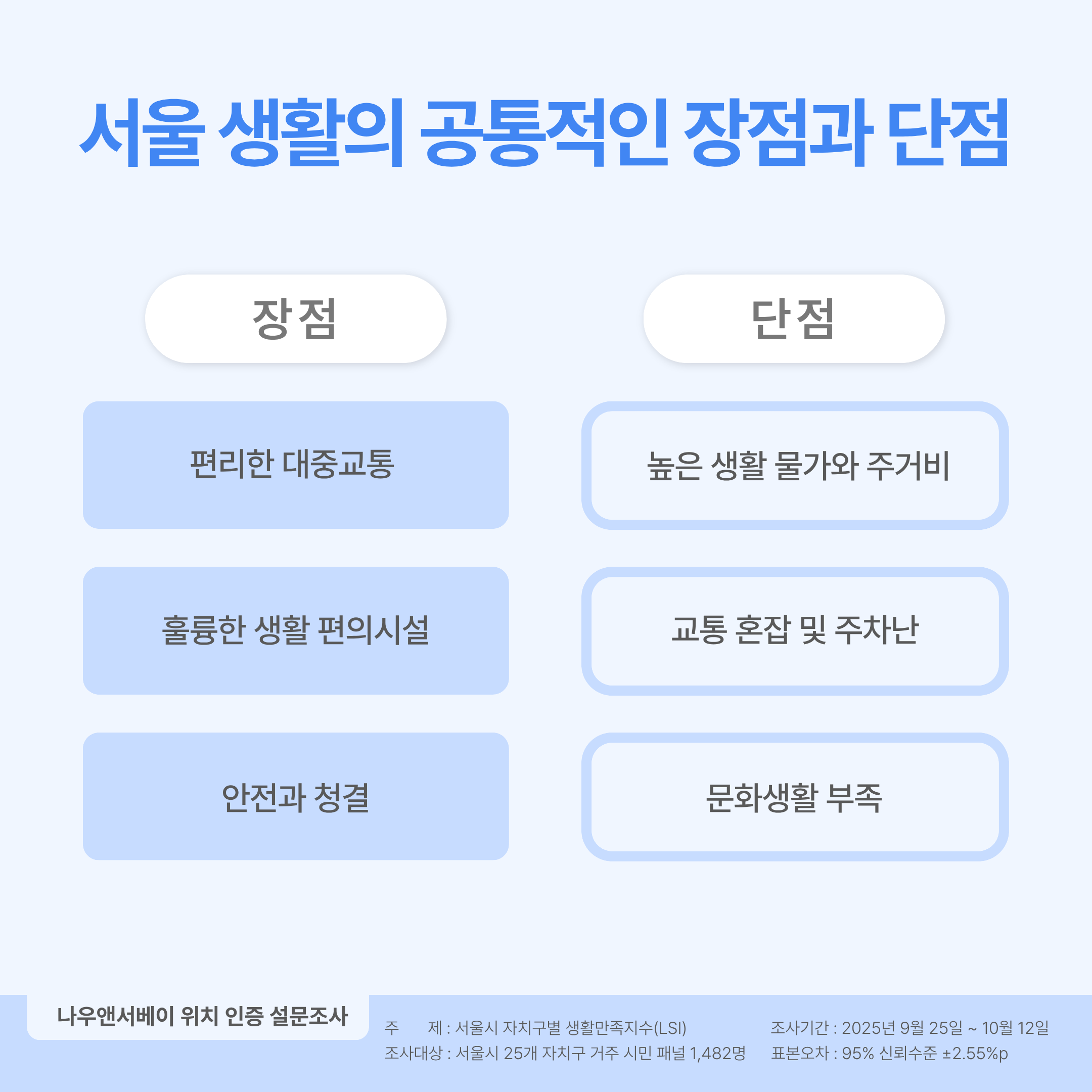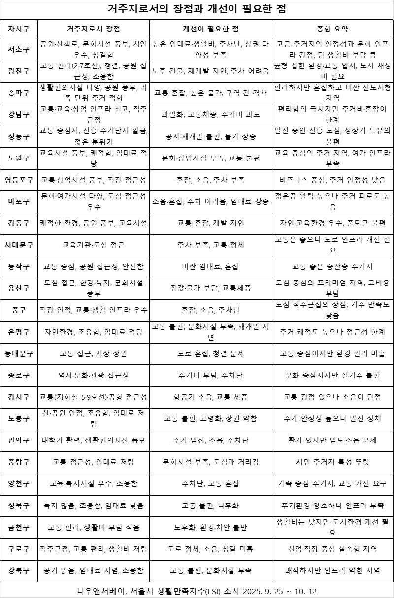 반면, 서울 생활의 가장 큰 단점은 높은 생활비와 주거비, 교통 혼잡과 주차난, 그리고 문화시설 부족으로 지적되었다. 특히 문화 인프라 격차가 자치구별 문화생활 점수 차이(최대 20.06점)로 나타났다. 권역별로는 서울 서남·북부권은 문화시설 확충과 안전환경 개선이, 동남권은 주차난 해소와 물가 안정이 주요 과제로 나타났다. (참조2: 자치구별 거주 장점과 개선점)