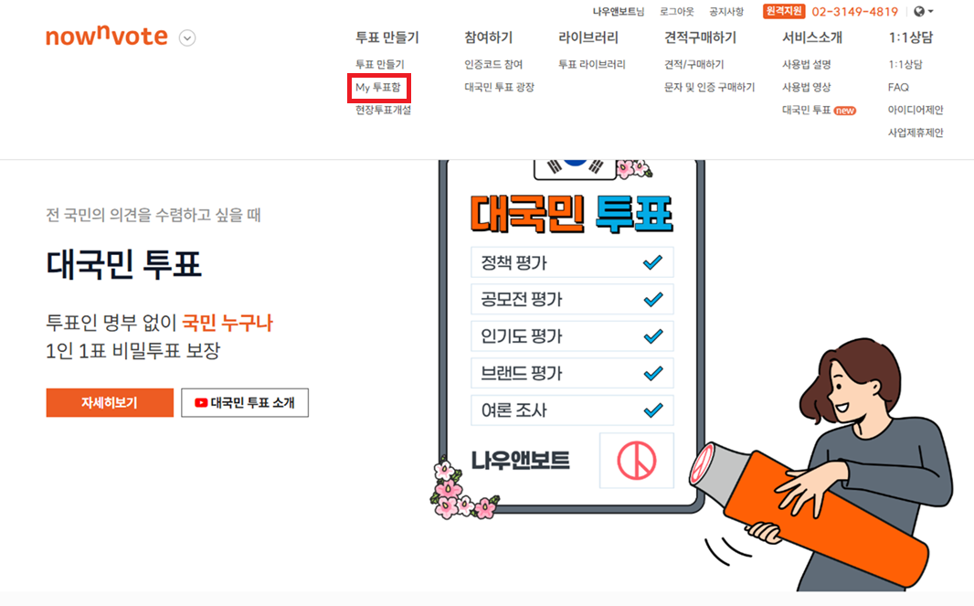 2. 나우앤보트 상단메뉴에서 ‘투표만들기’ -> ‘my 투표함’을 선택합니다.
